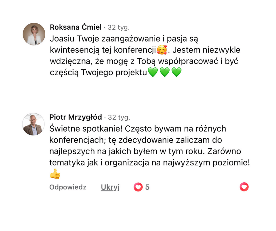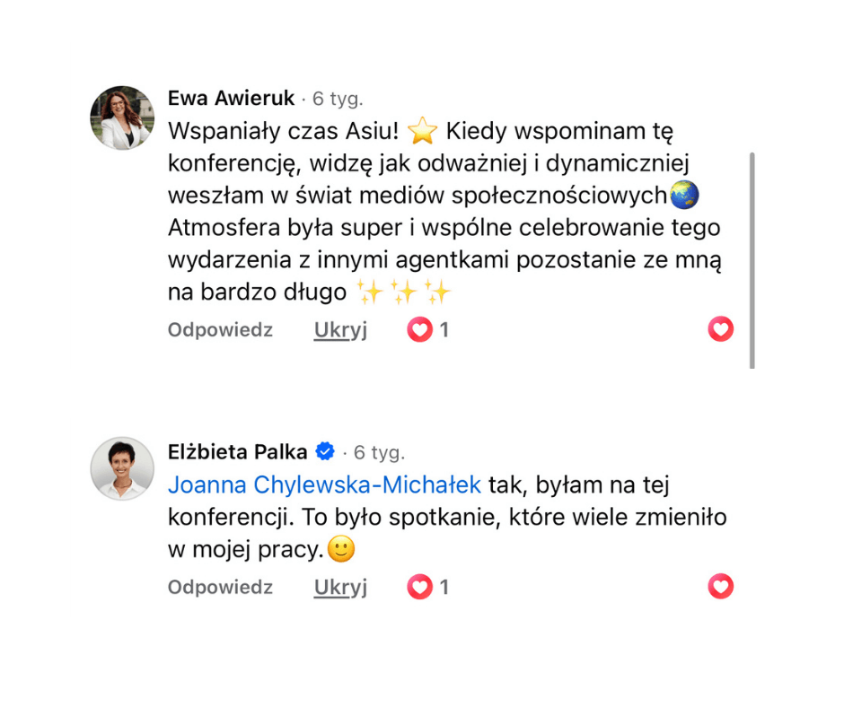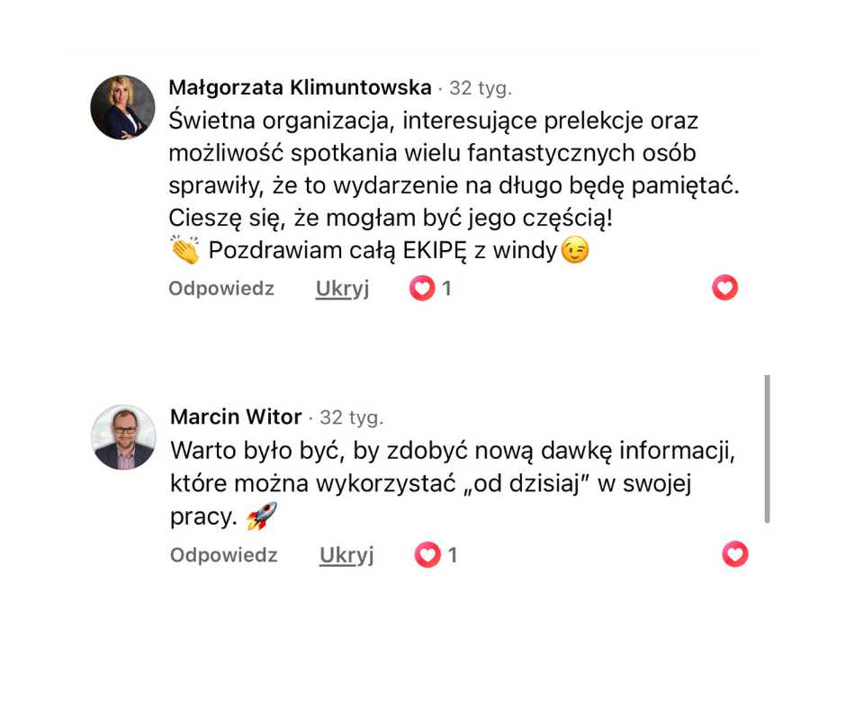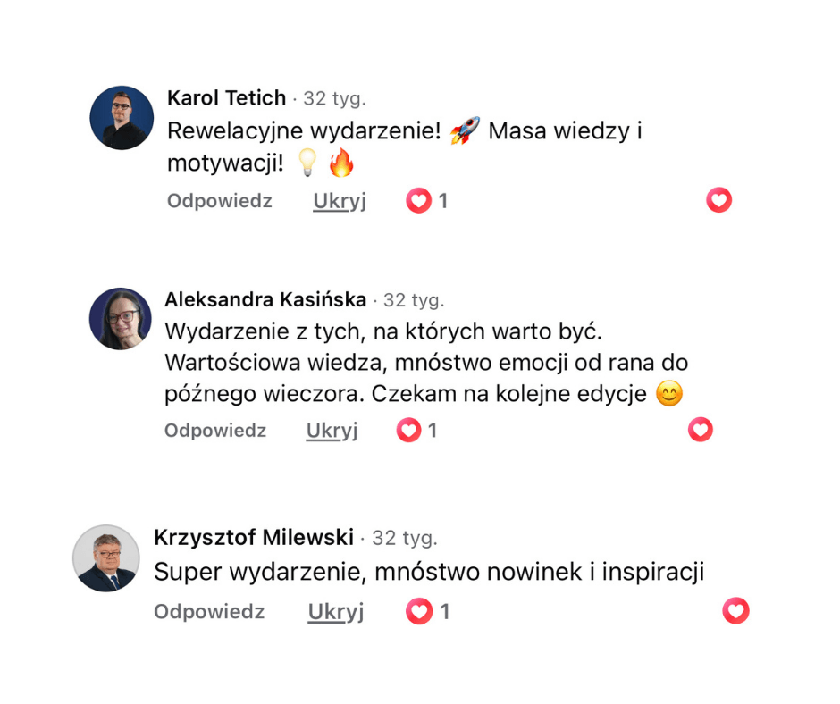 Konkretne strategie, narzędzia i gotowe rozwiązania, które możesz wdrożyć od razu. Uczestnicy poprzednich edycji wychodzili z planem działania, pomysłami na treści i nowymi sposobami pozyskiwania klientów.